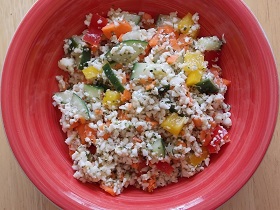 Grate cauliflower. Place in a bowl, and microwave for 45 seconds on high.